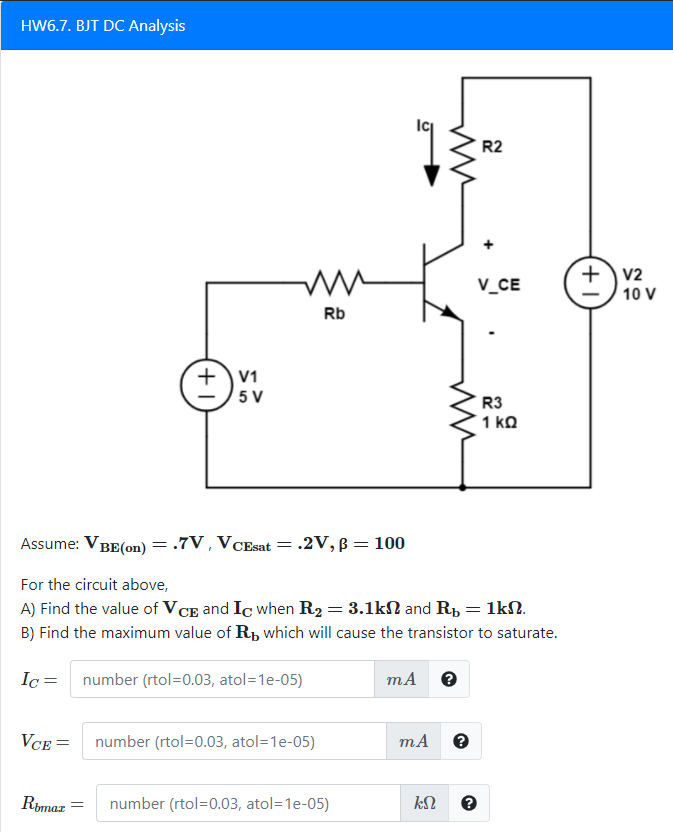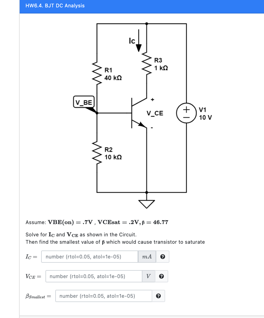 Solved Hw6 7 Bjt Dc Analysis R2 M V Ce V2 10 V Rb 1 Chegg Com